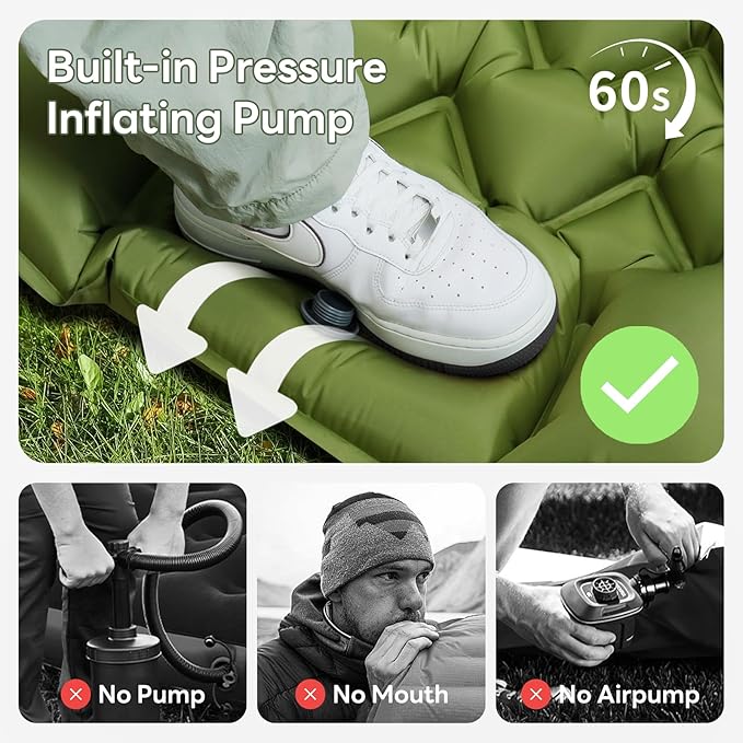 - ⚡【Advanced built-in Foot Pump】No need to inflate with your hands, mouth, or a pump for our camping sleeping pad. It just only takes 60s after you inflate the sleeping mat fully by stamping the spot of the built-in pump with your foot. children, and the elderly can easily complete it.