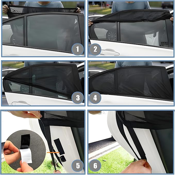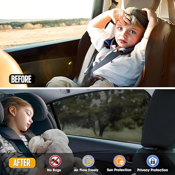 - UPGRADED UV,BUGS AND MOSQUITO PROTECTION: Our car window screen shade is made from durable nylon mesh that is breathable, stretchable, and provides complete privacy blackout. Designed to keep your children from UV, Bugs and Mosquito, it's also a great car window screen for camping.