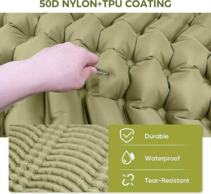 - ✅ 【Durable 50D Nylon & Waterproof】Built for the outdoors, this camping sleeping pad uses premium 50D nylon with a TPU seal coating for superior tear resistance, waterproofing, and easy cleaning. Ergonomically designed to support your body even in rugged environments, it's a top choice for serious hiking gear and backpacking gear. Rigorously tested for quality, this inflatable mattress ensures a cozy, reliable night's rest anywhere your adventures take you.