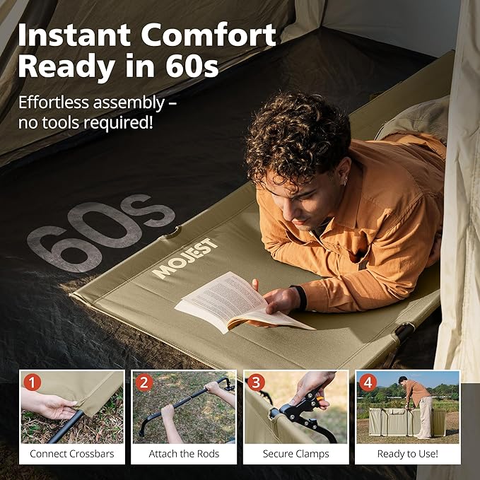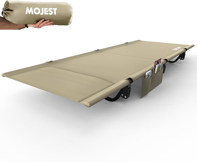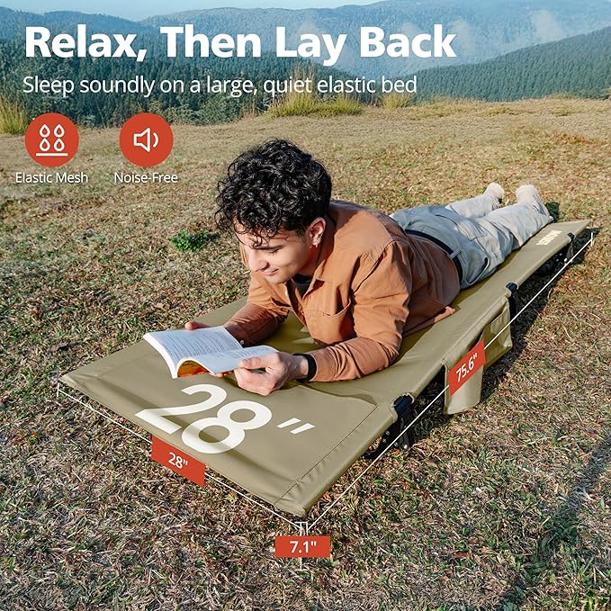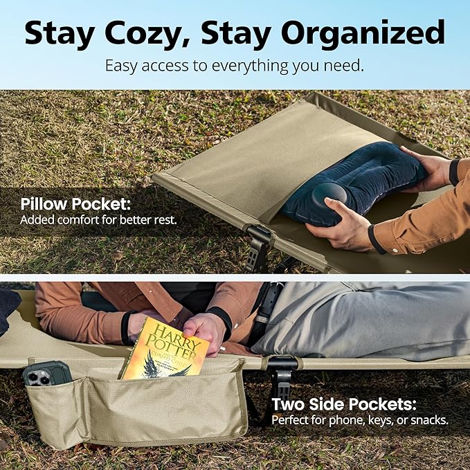 - Comfortable and Quiet Sleep – Rest peacefully on our firm camping cot with a durable Oxford fabric bed surface and an integrated pillow pocket for added comfort. Our 7-inch height design keeps you elevated, dry, and warm throughout the night