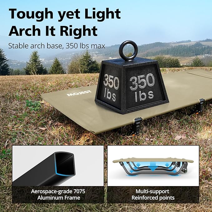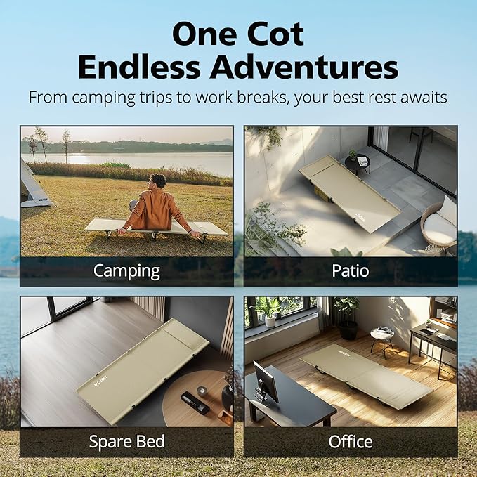 - Strong and Durable Design – Built with aerospace-grade 7075 aluminum alloy, our camping cot for adults supports up to 330 lbs. The dual-tube and mesh joint design ensure it withstands long-term use without sagging or tearing