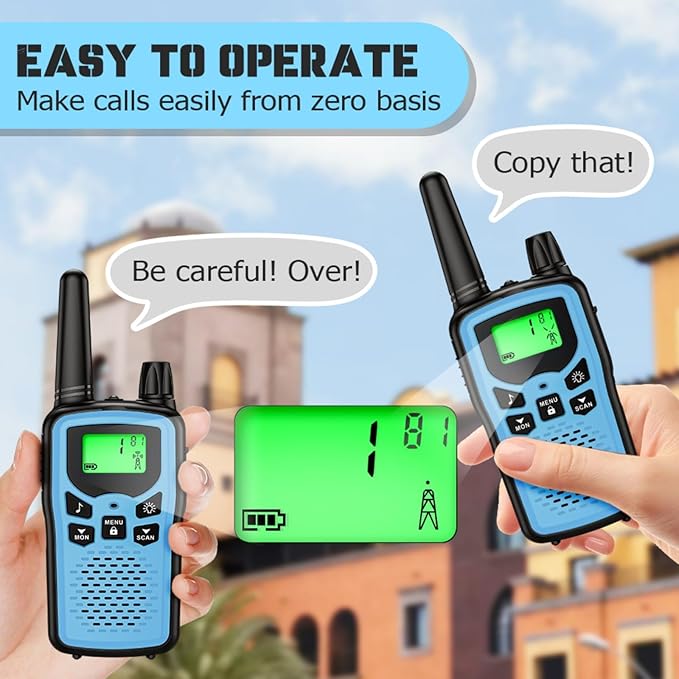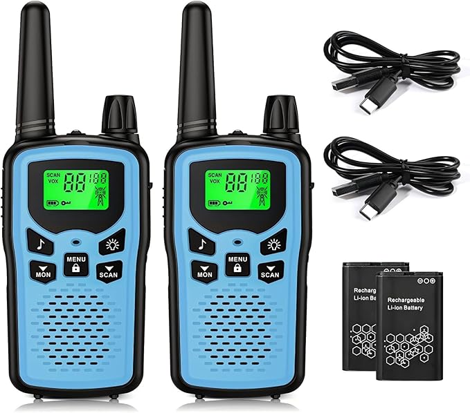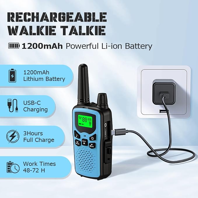 - Rechargeable Walkie Talkies: The Walkie Talkies features a powerful 1200mAh rechargeable lithium battery, replacing the previous AAA battery design. This upgrade allows for longer usage times and significantly improves convenience with outstanding standby time of up to 72 hours. You can enjoy extended communication without the hassle of replacing disposable batteries frequently
