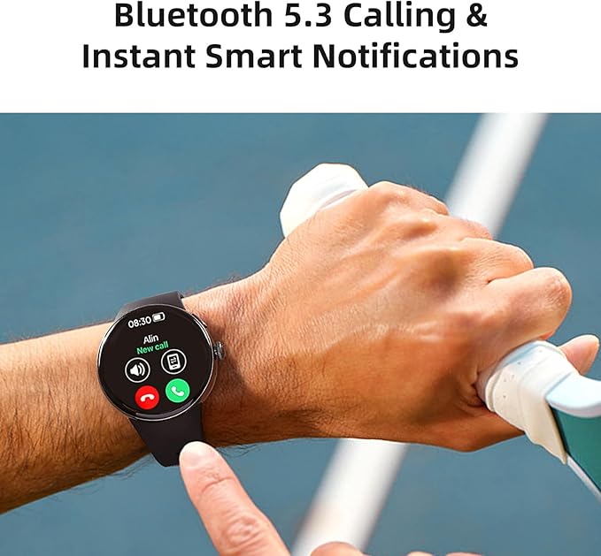 - 【BLUETOOTH 5.3 CALLING & SMART NOTIFICATIONS】Designed for both men and women, this sleek smartwatch boasts the latest Bluetooth 5.3 chip for ultra-clear, stable calls wherever you go. Featuring premium speakers and a built-in microphone, it lets you check call logs and sync up to 100 contacts—way beyond the usual 10-20 on most watches. Stay effortlessly connected with real-time notifications from Facebook, TikTok, WhatsApp, and more, gently vibrating on your wrist so you never miss a moment. Plus, the built-in AI voice assistant delivers quick, hands-free answers to keep you moving. Tip: You can’t reply to texts directly from the watch.