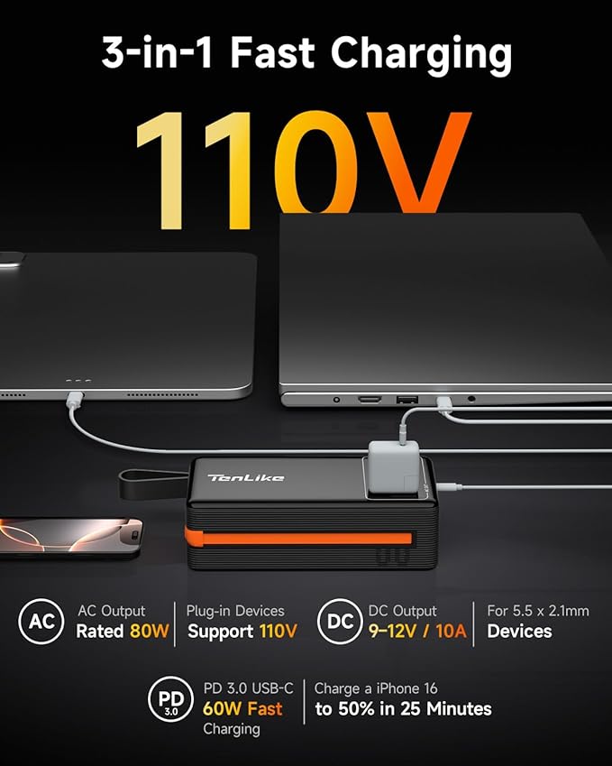 - 【Built-In 60W PD Fast Charging Cable】Our Tenlike power station features a built-in 60W PD fast charging cable, providing efficient charging for your devices. Quickly recharge your smartphone, tablet, or laptop, helping you stay powered up and connected when you need it most