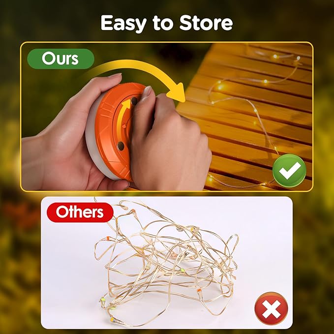 - Portable Storage: The camping light is only 7.4 ounces, very lightweight and portable, it can be easily put into a backpack or handheld device, a quick turn of the handle and the manual device ,32.8FT string lights can resume the camping light in only 30 seconds. The clever design of the string lights for camping ensures portable storage. Undoubtedly a camping essentials.