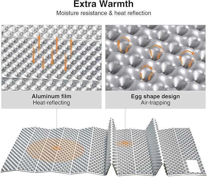 • Adaptive Thermal Performance Optimized for -5°C to 35°C (23°F to 95°F), the reflective heat-trapping layer enhances warmth retention in chilly conditions, while ventilation grooves reduce heat buildup in summer. UV-resistant materials prevent degradation during sun exposure, outperforming standard pads in multi-season versatility.