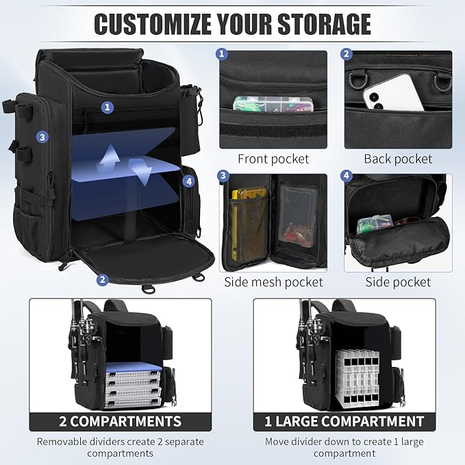 - 【DIY】 LASUK fishing backpack has a large capacity design with removable padded dividers. You can remove it . Just move the middle divider and snap it into place to create two separate storage spaces