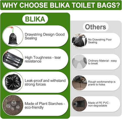 • 【Easy To Use & No Mess】BLIKA portable toilet kit is perfect to be accompanied with 8-gallon toilet replacement bags and eco absorbent gel. After using, rinse the seat with wipe paper as needed to keep clean. Camping toilet bag is made of plant starches and contain NO polyethylene. The portable toilet absorbent gel can quickly turns waste liquid into a solid gel that won't leak or splash out and gives off a light lemon scent.