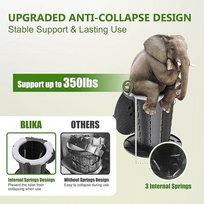 • 【Collapsible Design & Comfort】uilt with 3 internal springs & 70 safety latches, this heavy-duty toilet supports 350 lbs and won't collapse. Made of premium ABS material, it's durable and portable. The comfortable PU seat is waterproof, wear-resistant, and skin-friendly, perfect for year-round use. No more cold seats in winter or sticky heat in summer! Ideal for camping, hiking, RV trips, and more.