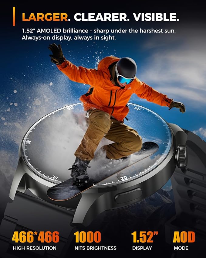 - CLEAR EVEN IN SUNLIGHT: The 1.52" AMOLED display with 466×466 resolution delivers sharp text and vibrant colors. Whether you're running outdoors or hiking in bright sunlight, your data remains easy to read. The always-on display ensures this pedometer watch keeps you informed at a glance
