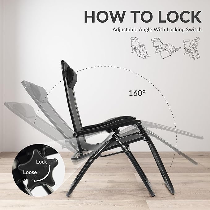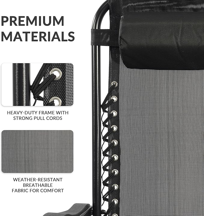 - Superior Comfort: Zero gravity chairs set of 2 are engineered to provide the ultimate relaxation experience, supporting up to 300 pounds. With dimensions of 43.5" x 25.5" x 35.5" when open. With the elastic buttons on both sides of the chair allows you to find your perfect position, whether you want to sit upright or lie back completely. Includes removable pillow, perfect for camping chairs, patio chairs, and even beach chairs, this chair helps you unwind effortlessly