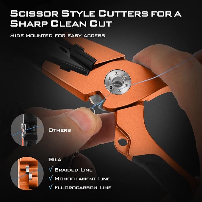 - LINE SCISSORS & DEHOOKER: The titanium coated chrome vanadium fishing line cutters cut though mono, fluorocarbon, or braided lines with ease and leave a sharp clean cut. These side mounted scissor cutters allow you to cut your tag end as close to the knot as you want