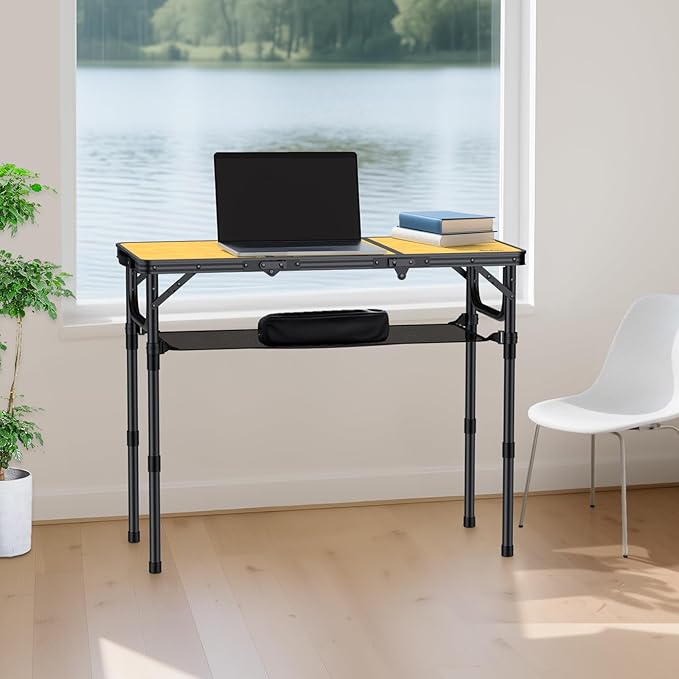 3ft Camping Table Foldable with Storage Net and Bag, 3 Adjustable Heights High 27.5" Aluminum Camping Table, Portable, for Outdoor Indoor Backyard BBQ Cooking Party Picnic Beach, Yellow