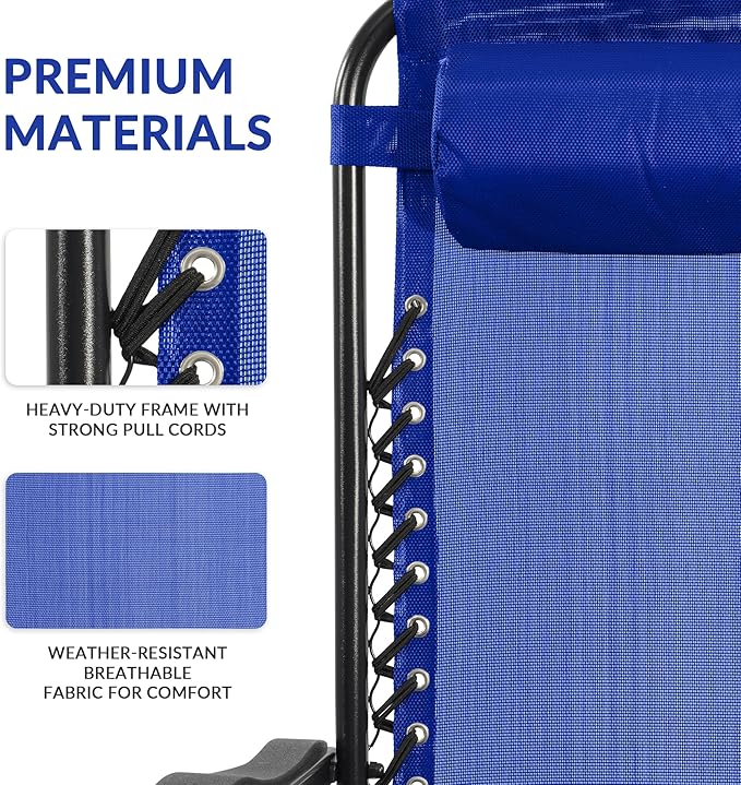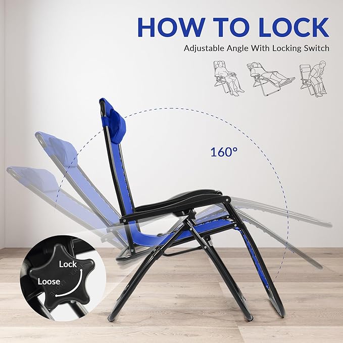 - Superior Comfort: Zero gravity chair is engineered to provide the ultimate relaxation experience, supporting up to 300 pounds. With dimensions of 43.5" x 25.5" x 35.5" when open. With the elastic buttons on both sides of the chair allows you to find your perfect position, whether you want to sit upright or lie back completely. Includes removable pillow, perfect for camping chairs, patio chairs, and even beach chairs, this chair helps you unwind effortlessly