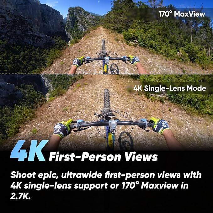 - 4K Single-Lens Mode: Select a lens to shoot wide-angle footage just like a single-lens action cam. Get maximum resolution with 4K30fps or an extremely wide 170° field of view with 2.7K MaxView. Your first-person view footage has never looked so good.