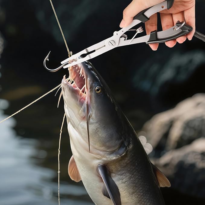 - MULTIFUNCTIONAL DESIGN IN ONE: Professional fishing pliers design, including serrated jaws with a 2.2 inch opening that can easily grip and remove any fishhook. It also serves as a braid cutter and dehooker tool fishing, with a stainless steel cutter to quickly cut braided line, fly line, and backing line. A versatile addition to any angler's toolkit.